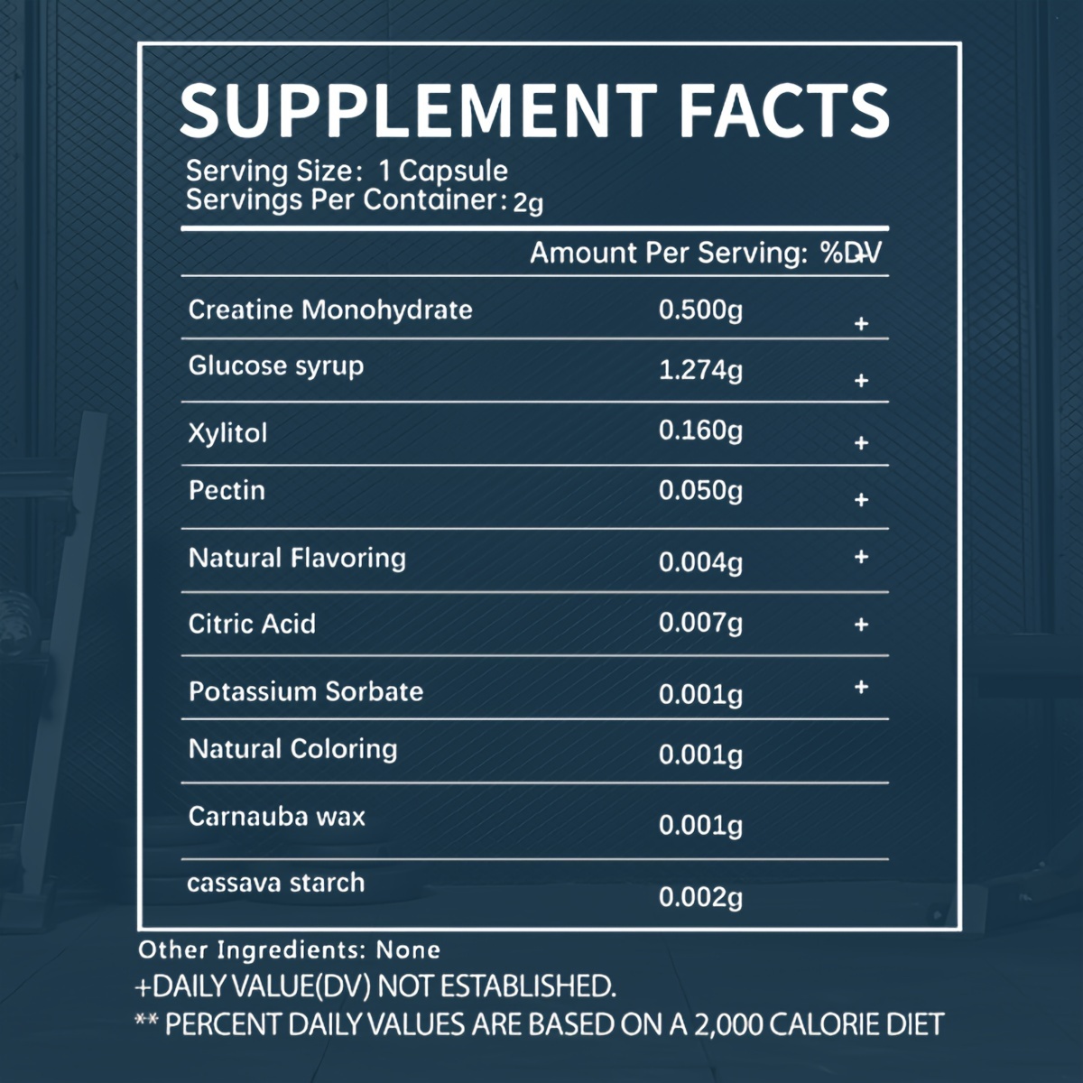 Más fuerza y rendimiento sin pastillas. Disfruta tu creatina diaria en formato de gomitas con sabor delicioso a blueberry o fresa. Perfectas para entrenamientos de fuerza, crossfit o gym, y para quienes prefieren una toma fácil y cómoda.